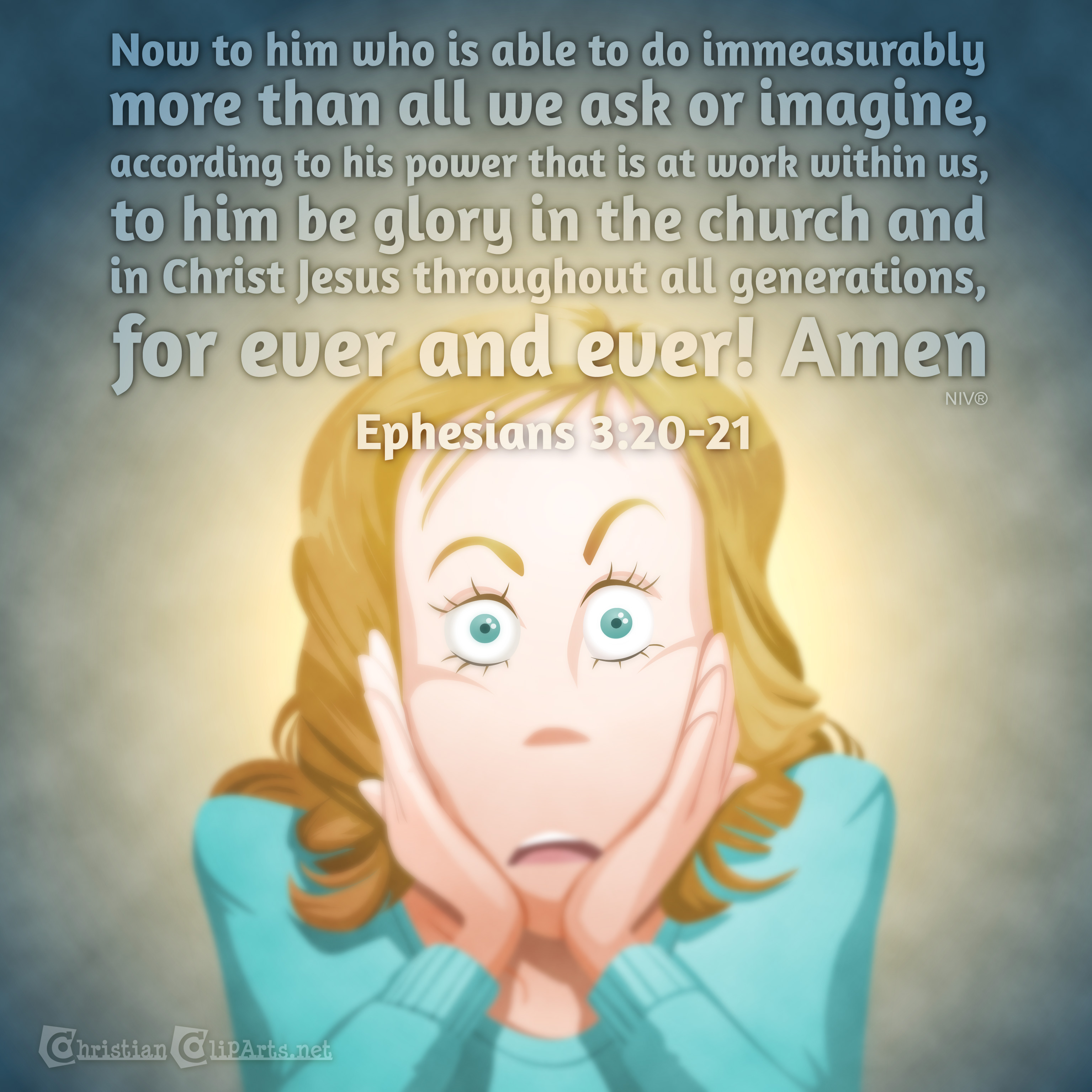 Now to him who is able to do immeasurably more than all we ask or imagine, according to his power that is at work within us, to him be glory in the church and in Christ Jesus throughout all generations, for ever and ever! Amen. |