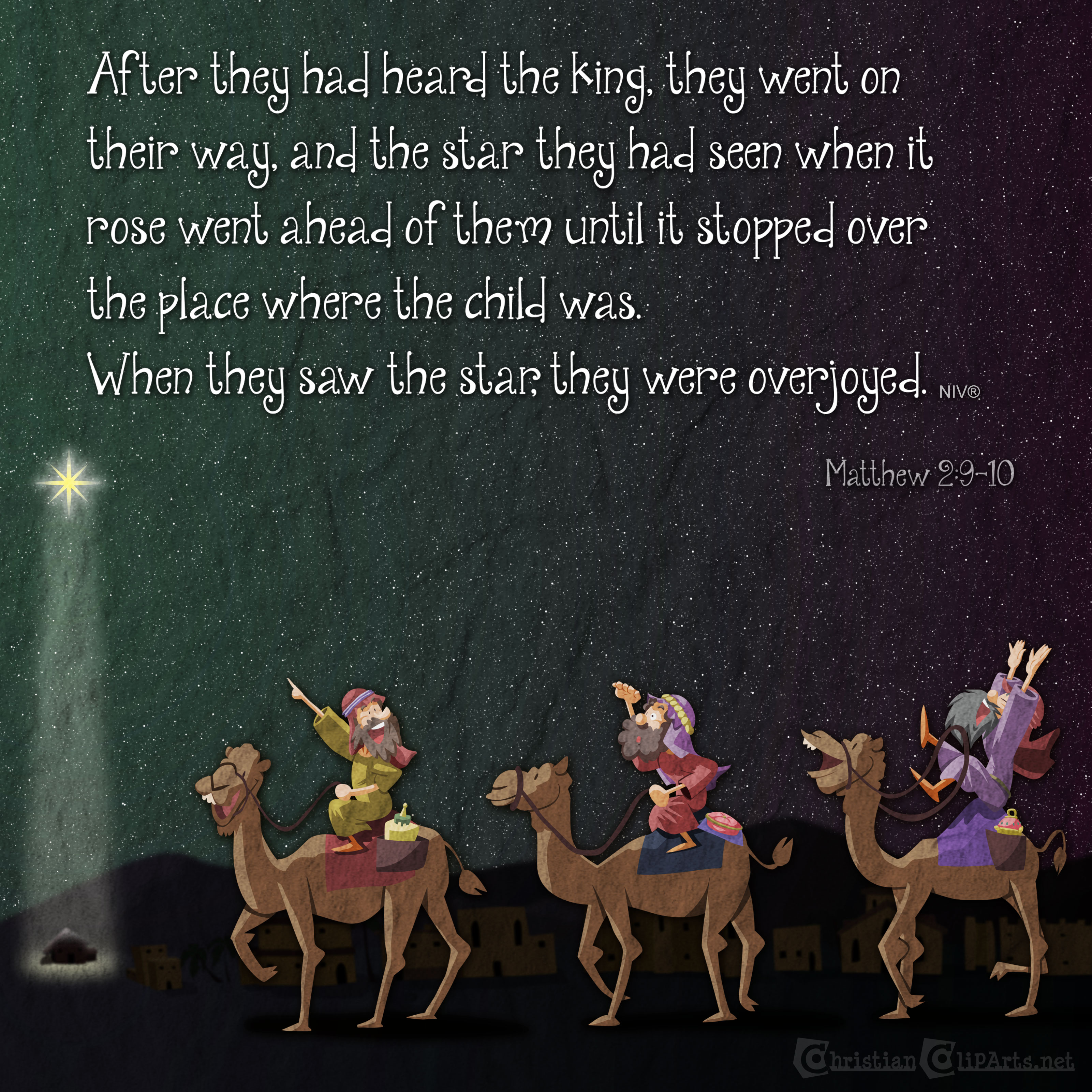 After they had heard the king, they went on their way, and the star they had seen when it rose went ahead of them until it stopped over the place where the child was. When they saw the star, they were overjoyed. |